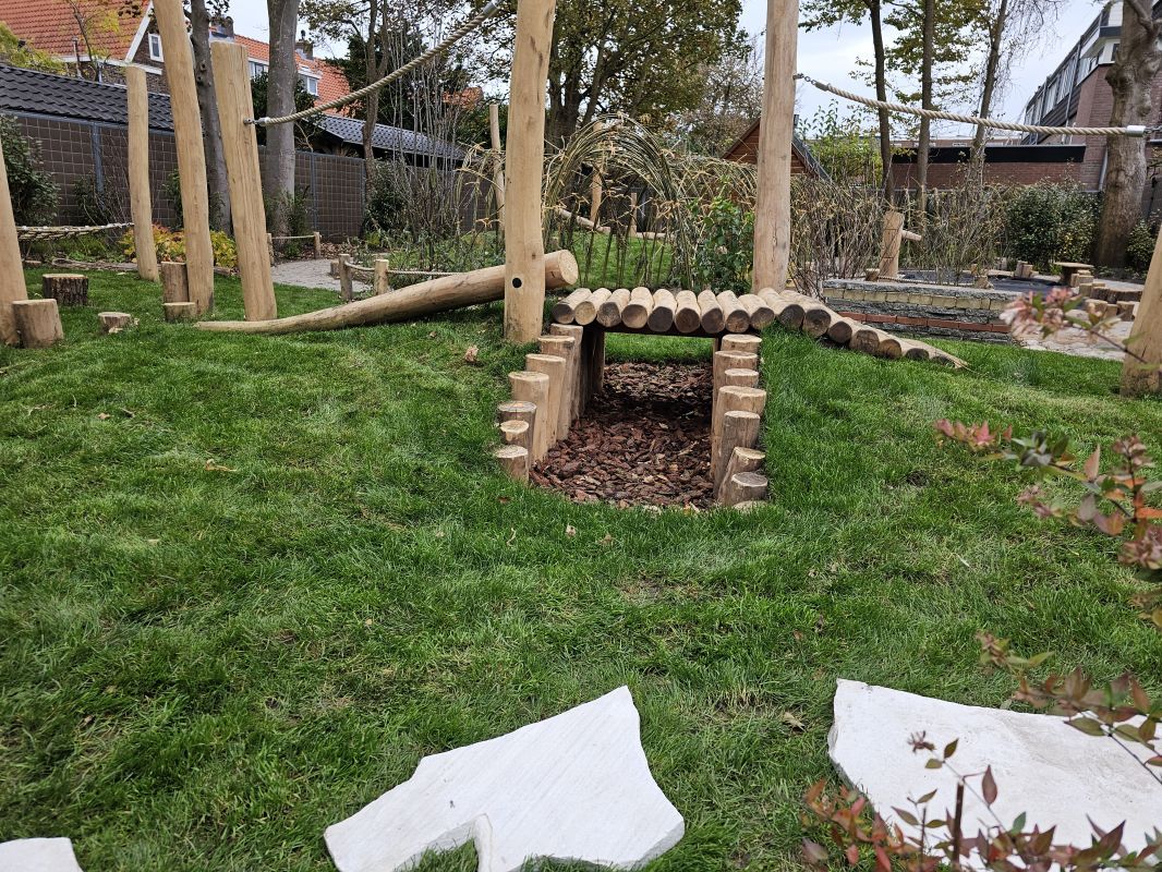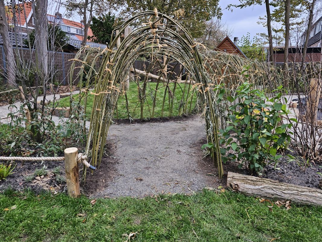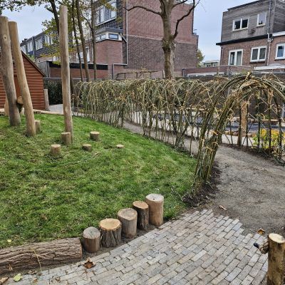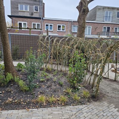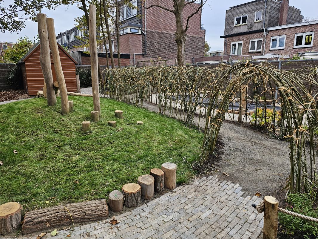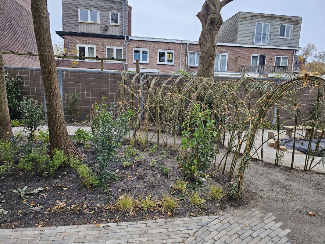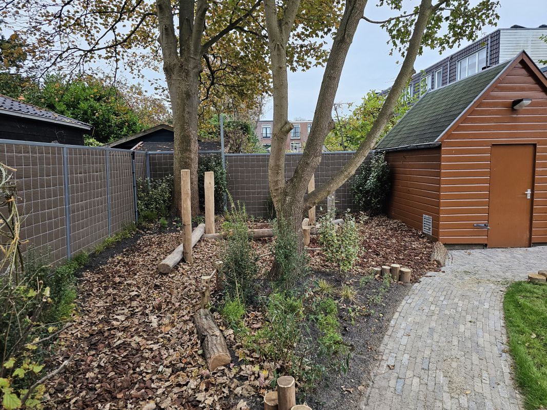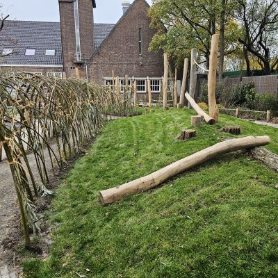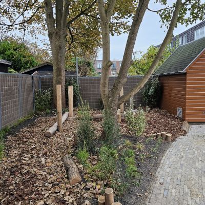Naast particuliere tuinaanleg wordt HK Groen regelmatig ingeschakeld door een landelijke kinderdagverblijfketen voor aanleg en tuinonderhoud. Zo ook voor de volledige tuinaanleg bij een nieuwe vestiging in Haarlem die in februari 2026 opent. Natuurlijk spelen en ontdekken staat bij deze KDV-keten hoog in het vaandel. Dit wordt op allerlei manieren verwerkt in de uitvoering van het tuinontwerp van Wiggers Design. Van boomschorspad tot wilgentunnel. Van zandbak en klimparcours tot aan sterke en diverse beplanting. Alles wordt door de hoveniers van HK Groen met precisie en oog voor veiligheid aangelegd. En waar voorheen de houten speeltoestellen werden ingekocht, worden deze inmiddels door HK Groen zélf gemaakt en geplaatst. Nog even en de baby’s, dreumesen en peuters kunnen hun hart ophalen in deze sensorische en avontuurlijke speeltuin.