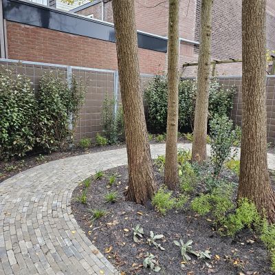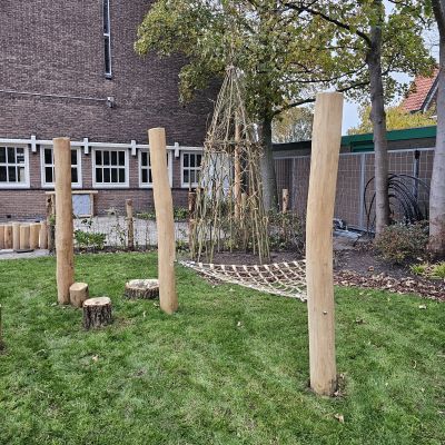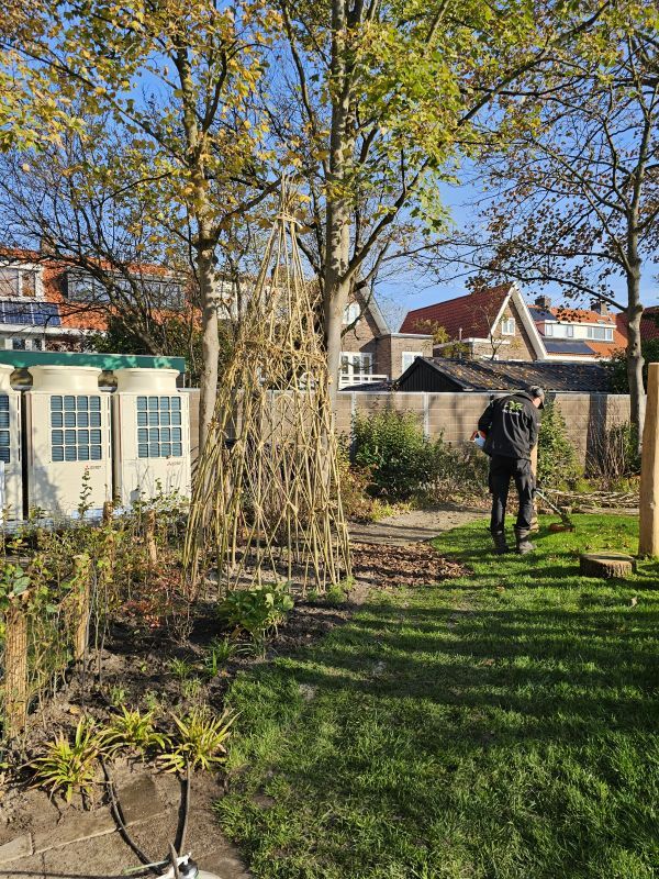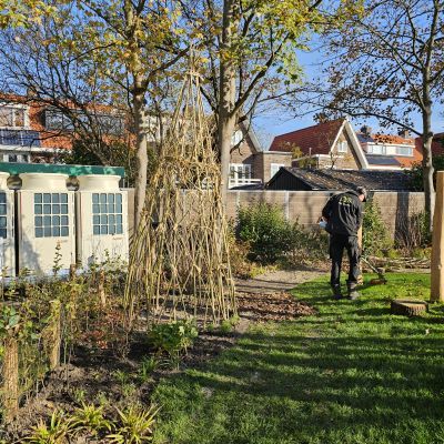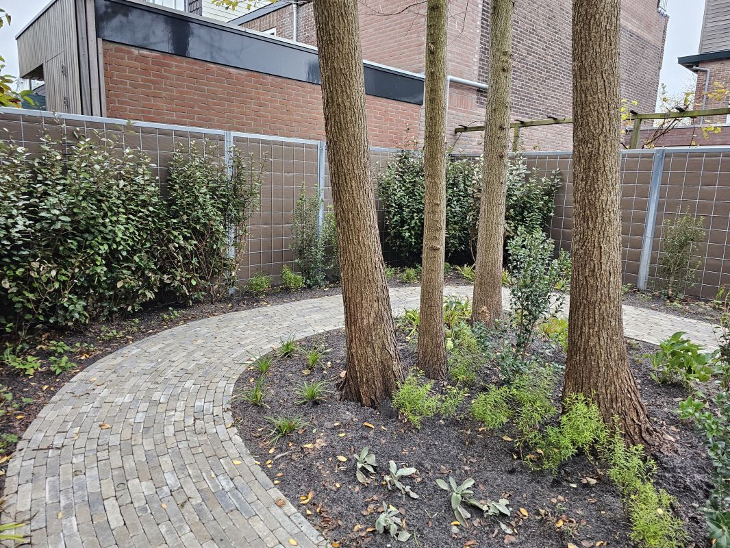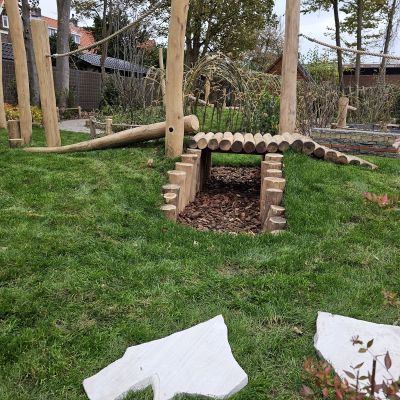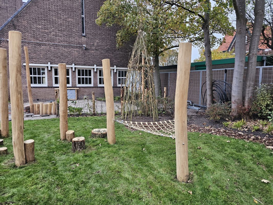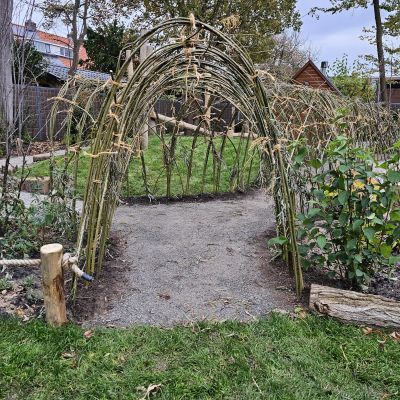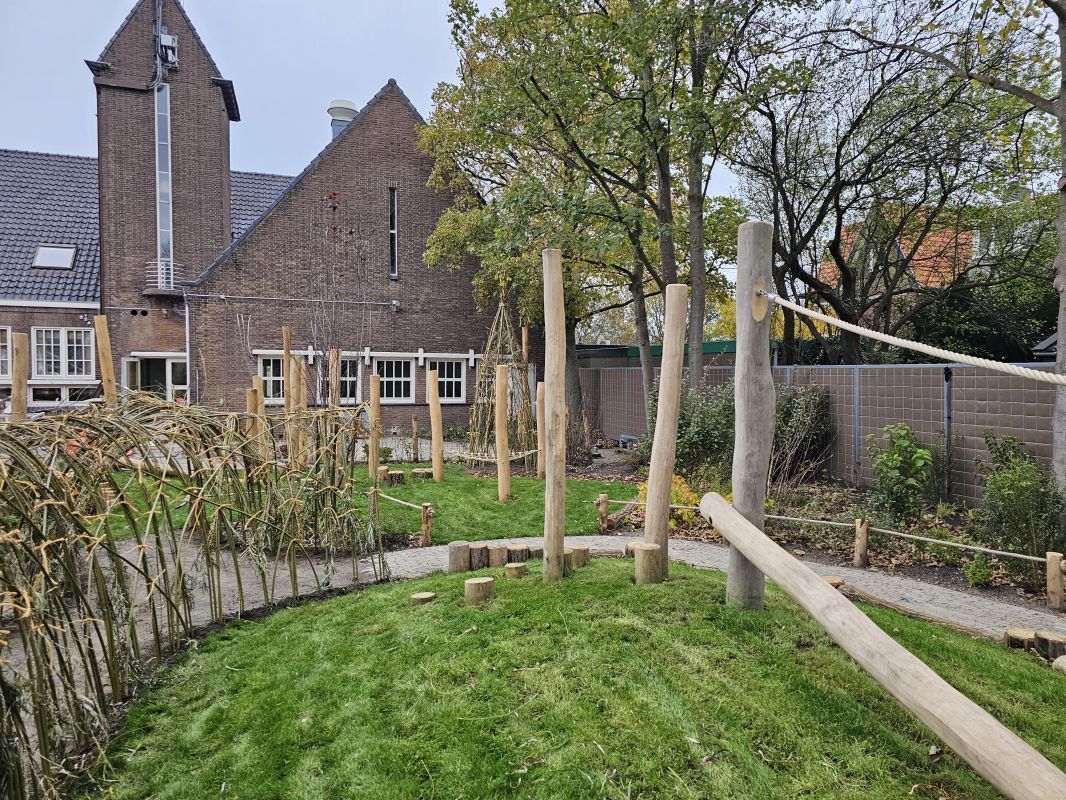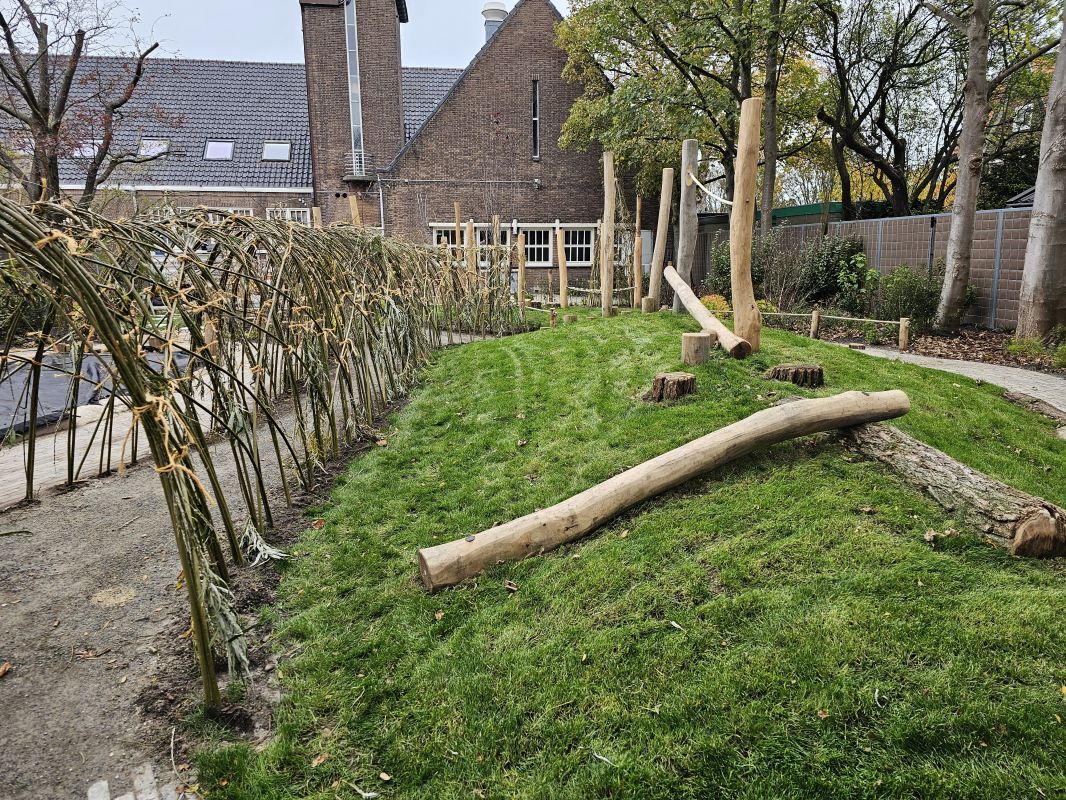 Naast particuliere tuinaanleg wordt HK Groen regelmatig ingeschakeld door een landelijke kinderdagverblijfketen voor aanleg en tuinonderhoud. Zo ook voor de volledige tuinaanleg bij een nieuwe vestiging in Haarlem die in februari 2026 opent. Natuurlijk spelen en ontdekken staat bij deze KDV-keten hoog in het vaandel. Dit wordt op allerlei manieren verwerkt in de uitvoering van het tuinontwerp van Wiggers Design. Van boomschorspad tot wilgentunnel. Van zandbak en klimparcours tot aan sterke en diverse beplanting. Alles wordt door de hoveniers van HK Groen met precisie en oog voor veiligheid aangelegd. En waar voorheen de houten speeltoestellen werden ingekocht, worden deze inmiddels door HK Groen zélf gemaakt en geplaatst. Nog even en de baby’s, dreumesen en peuters kunnen hun hart ophalen in deze sensorische en avontuurlijke speeltuin.