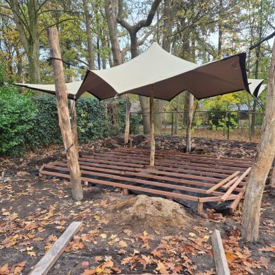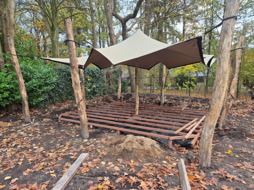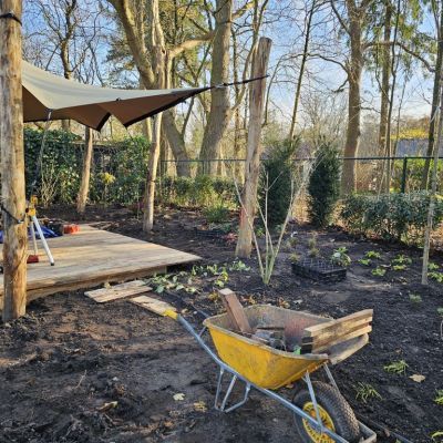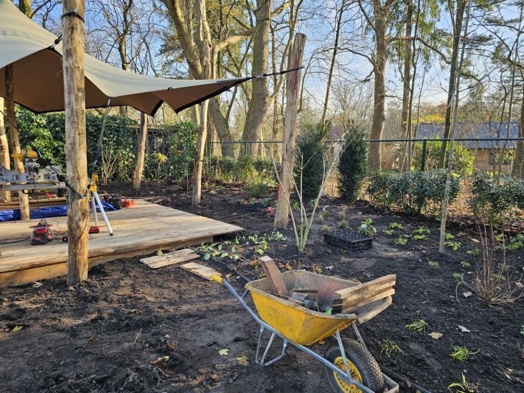 Een flink aantal bomen en heesters zijn behouden. verse grond en zand is aangevoerd en verwerkt in de tuin. Het zwembad en de keerwanden rondom het zwembadterras zijn geplaatst. De hardhouten vlonder, houten palen en het schaduwdoek van het achterste terras zijn geplaatst. En de borders zijn voorzien van bomen, hagen, heesters en beplanting.